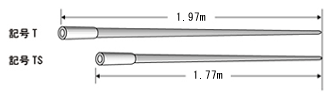 | 長い先竿(1.97m)をT、短い先竿(1.77m)をTSという記号で表します。 Tという記号は先竿をTOPと言うからです。TOP竿の短い方がSHORTなのでTSという記号になります。 |